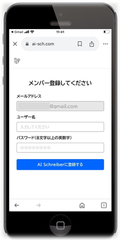メンバー登録画面でユーザー名とパスワードを設定し、登録ボタンをタップします。
