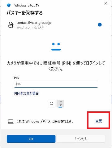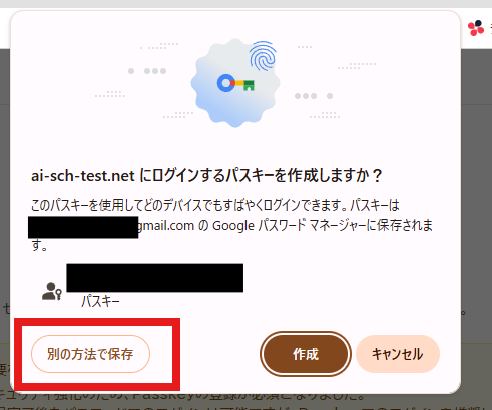 パスキーを登録ボタンを押すと、次のような画面が出るケースがありますが、「別の方法で保存」をクリックし、「Windows Hello または 外部セキュリティキー」を選択します。