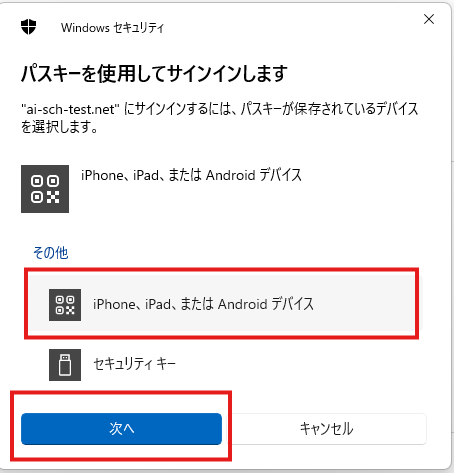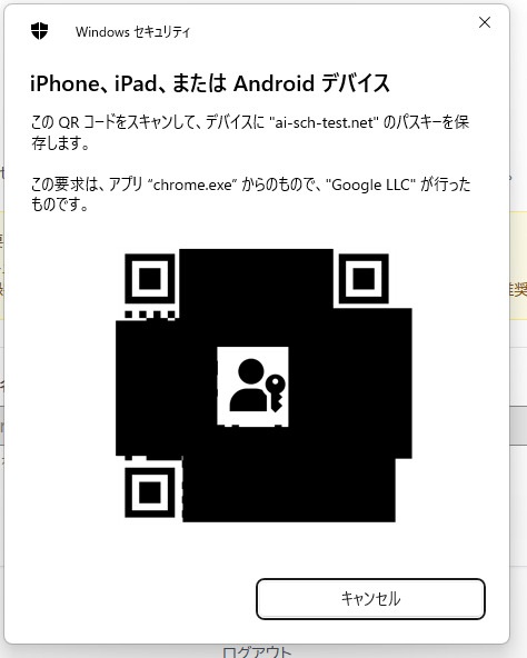 表示されたQRコードをパスキーが保存されたiPhoneで読み込みます。
