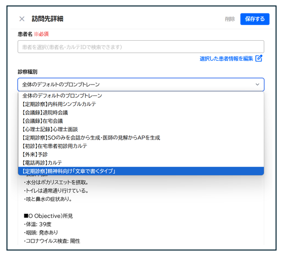 新しく追加された診療種別から再生成の目的に適したプロンプトを選択します。