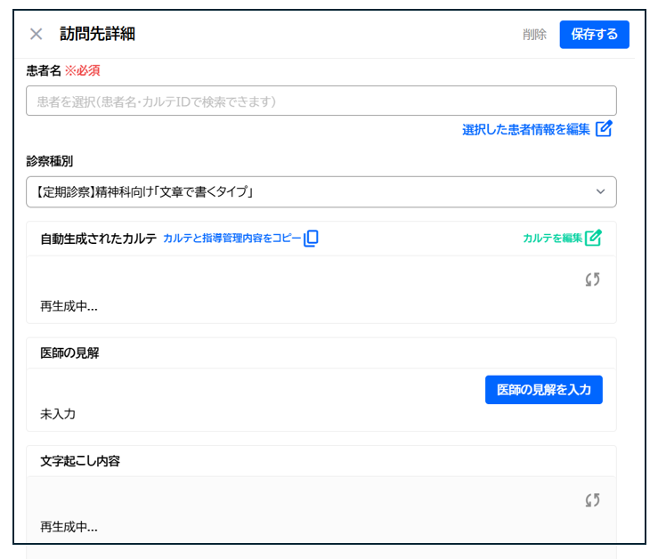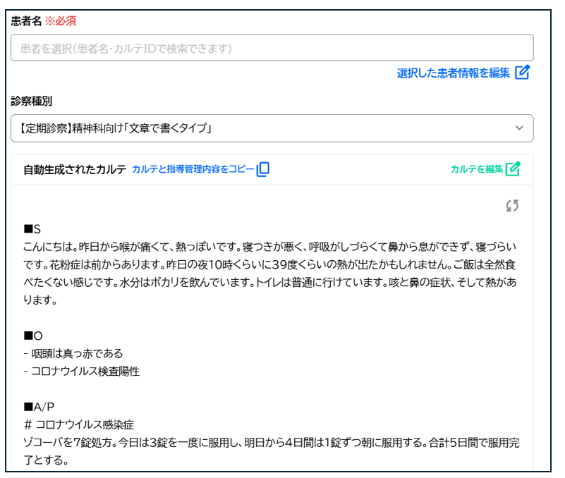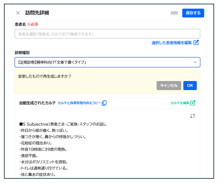 再生成が完了すると新しいカルテが表示されます。