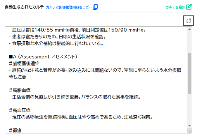 赤枠の矢印2本マークでカルテの再生成を行うことができます。同じ文字起こしの内容から違う形のカルテに変えることができます。