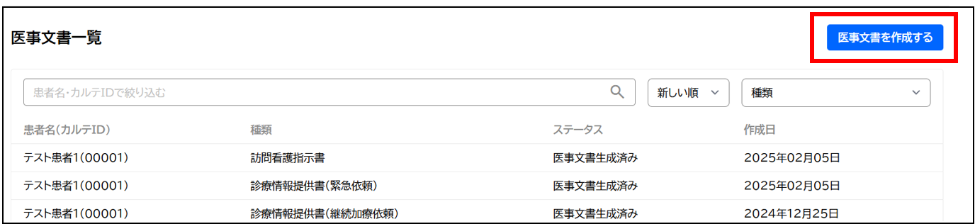 右上の「医事文書を作成する」をクリックします。