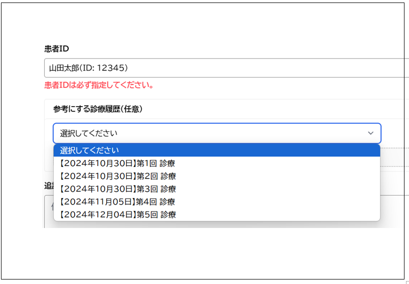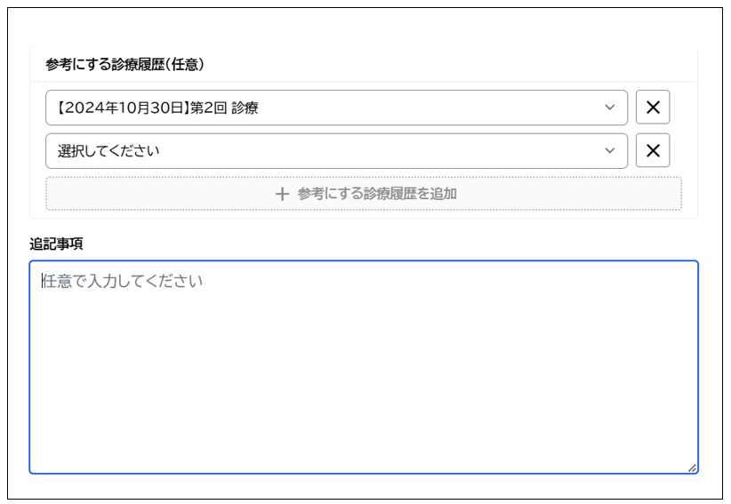 💡 ヒント: 追記事項で必要な情報を入力したり、カルテを選ばずに他の書類やデータからコピペしたものだけでも作成可能です。