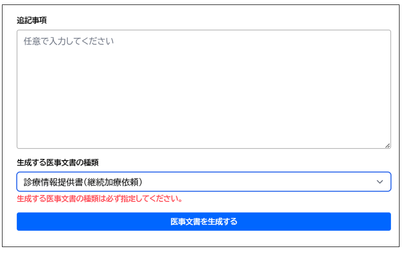 最後に医事文書の種類を選択し、青色の「医事文書を生成する」ボタンをクリックします。