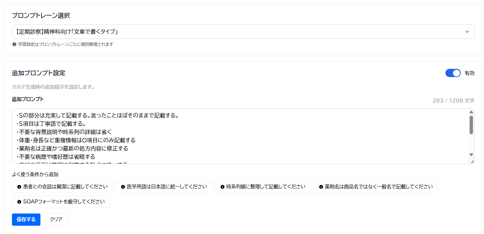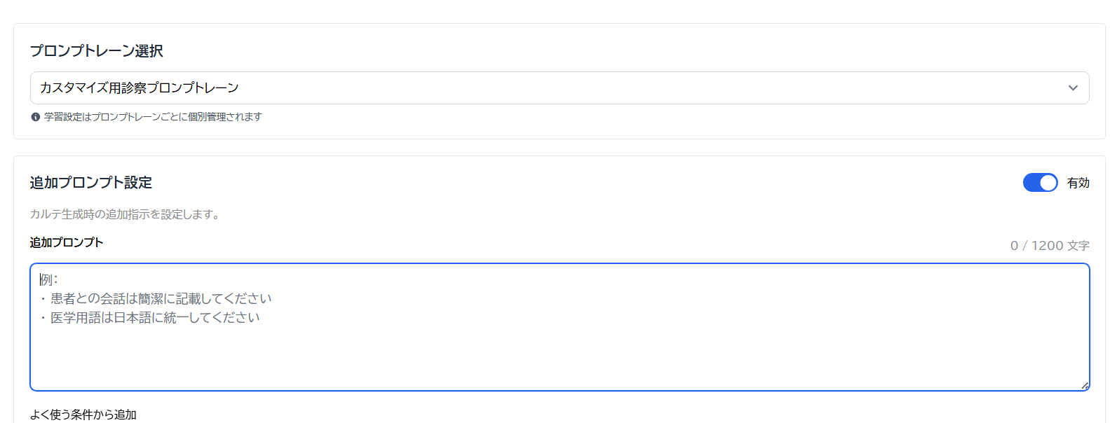 特別に用意された「カスタマイズ用診察プロンプトレーン」を使用することで、完全に自由な形式でのカルテ作成が可能です。
